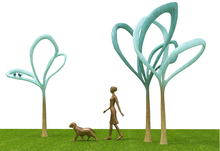 여인과 강아지와 파랑새는 단순처리 된 구상으로 표현하고 나무는 추상적으로 도안화하여 매스를 지양하고 공간감을 살림으로써 경쾌한 느낌을 강조하였다. 작품을 잔디 위에 직접 설치하여 작품 속에 등장하는 모티브들이 자연 공간 속에 있는 것처럼 연출하였다.