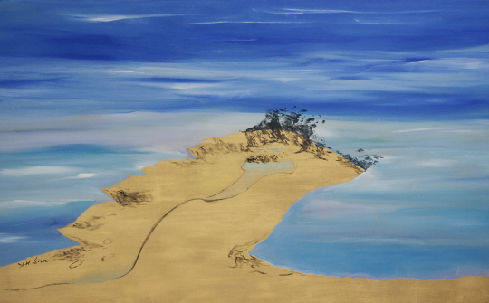▲ 상념 광활한 대서양의 짙푸르름은 저 멀리 하늘 위에 닿아서 그 님에게 향하고 있구나. 페어웨이도 덩달아 춤을 추듯 솟아 있고, 그 속에 노니는 여인 또한 흥분되어 있구나. 2019년 작. 김영화 화백
