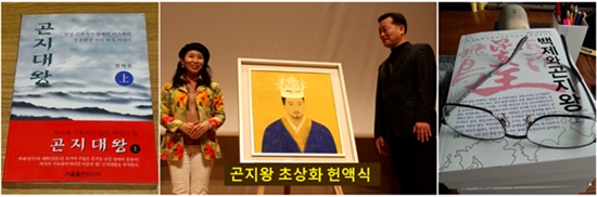 ▲ 곤지왕 초상화 헌액식(가운데) 및 곤지왕 관련 소설. [사진=필자제공]