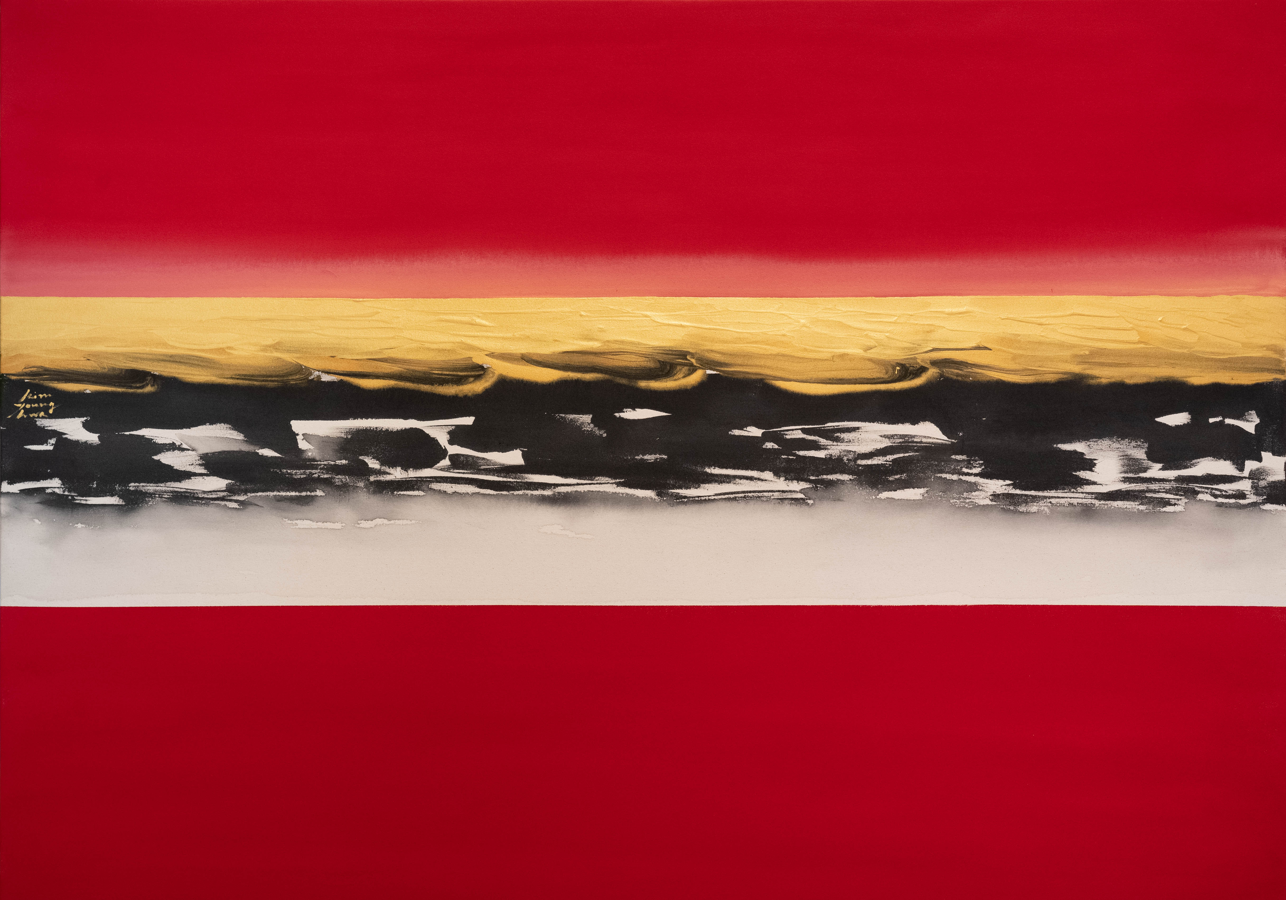 This painting presents a striking interplay of color and texture that evokes strong emotional responses. The deep red at both the top and bottom creates a sense of boldness and intensity, while the golden-yellow band in the middle introduces warmth and vibrancy. The textural patterns in the yellow and black bands add depth and complexity, engaging the viewer and inviting closer inspection.