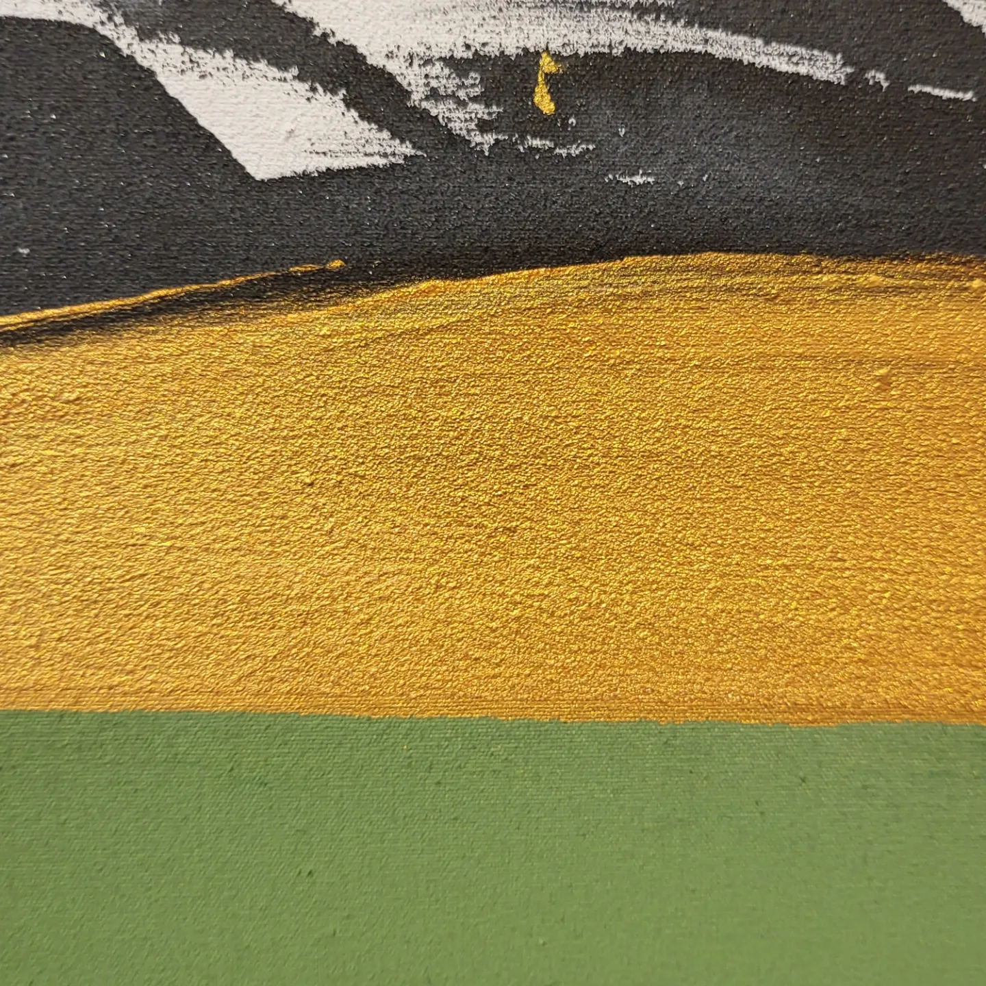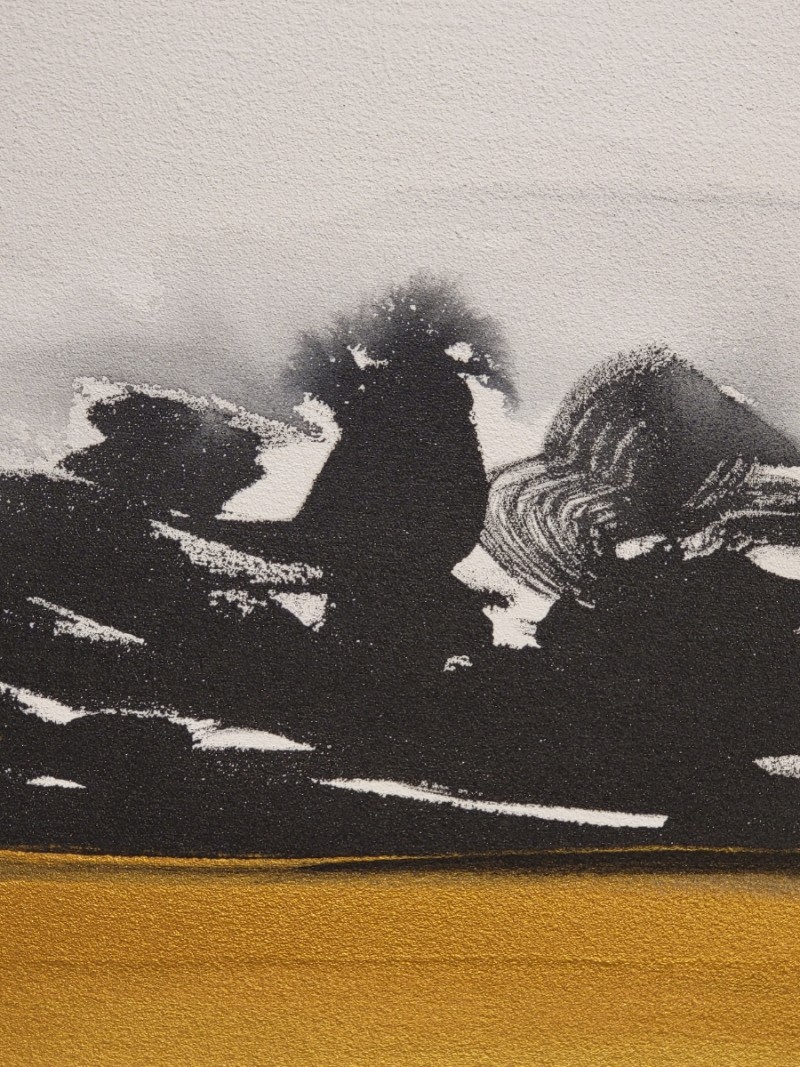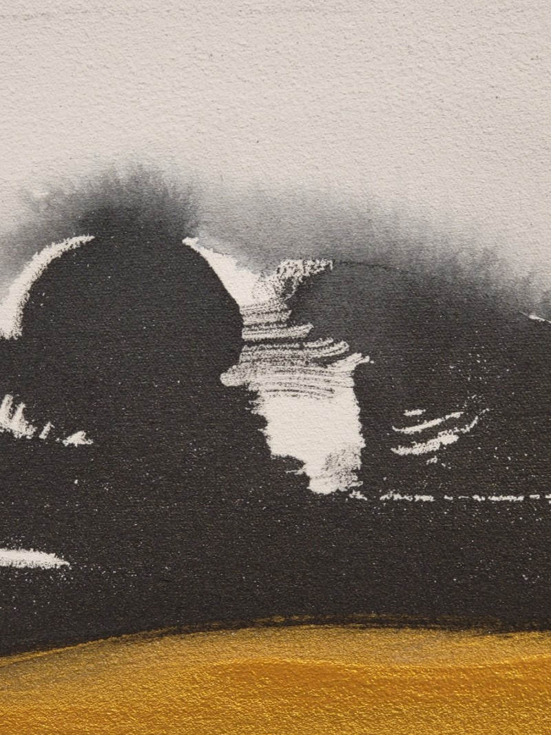 The non-figurative work of color, ink, and gold powder on the three-division plane added a sense of stability to her paintings. The number 3 means perfection. It reduces the stress of choice, creates balance and creates a sense of rhythm.