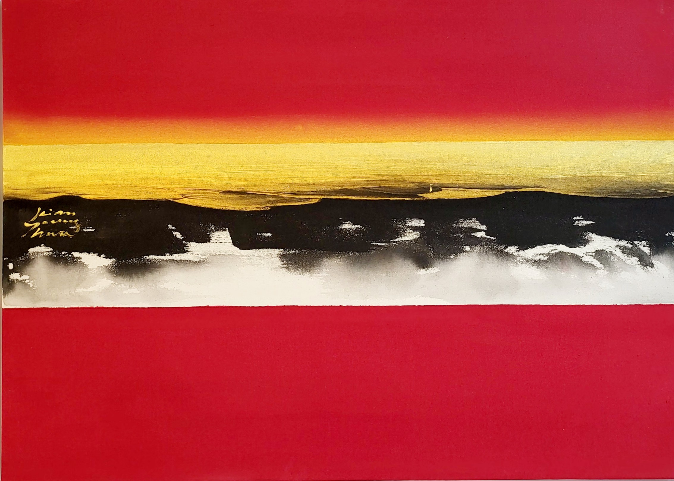 These paintings may seem abstract, representing modern art's symbolic gestures, but they encapsulate profound Eastern philosophical principles. Kim Young-hwa captures what's beyond the visible world, drawn from the world of meditation. The ripples of her inner subconscious originate from the insight that the universe exists within her. Her work flows effortlessly as if following the lines, mirroring the essence of Eastern art. Her deep ink and golden touches, along with intense and rich colors, continuously express her concepts. Her artwork is truly a meditation in itself - created through meditation, it leads viewers to meditate themselves.