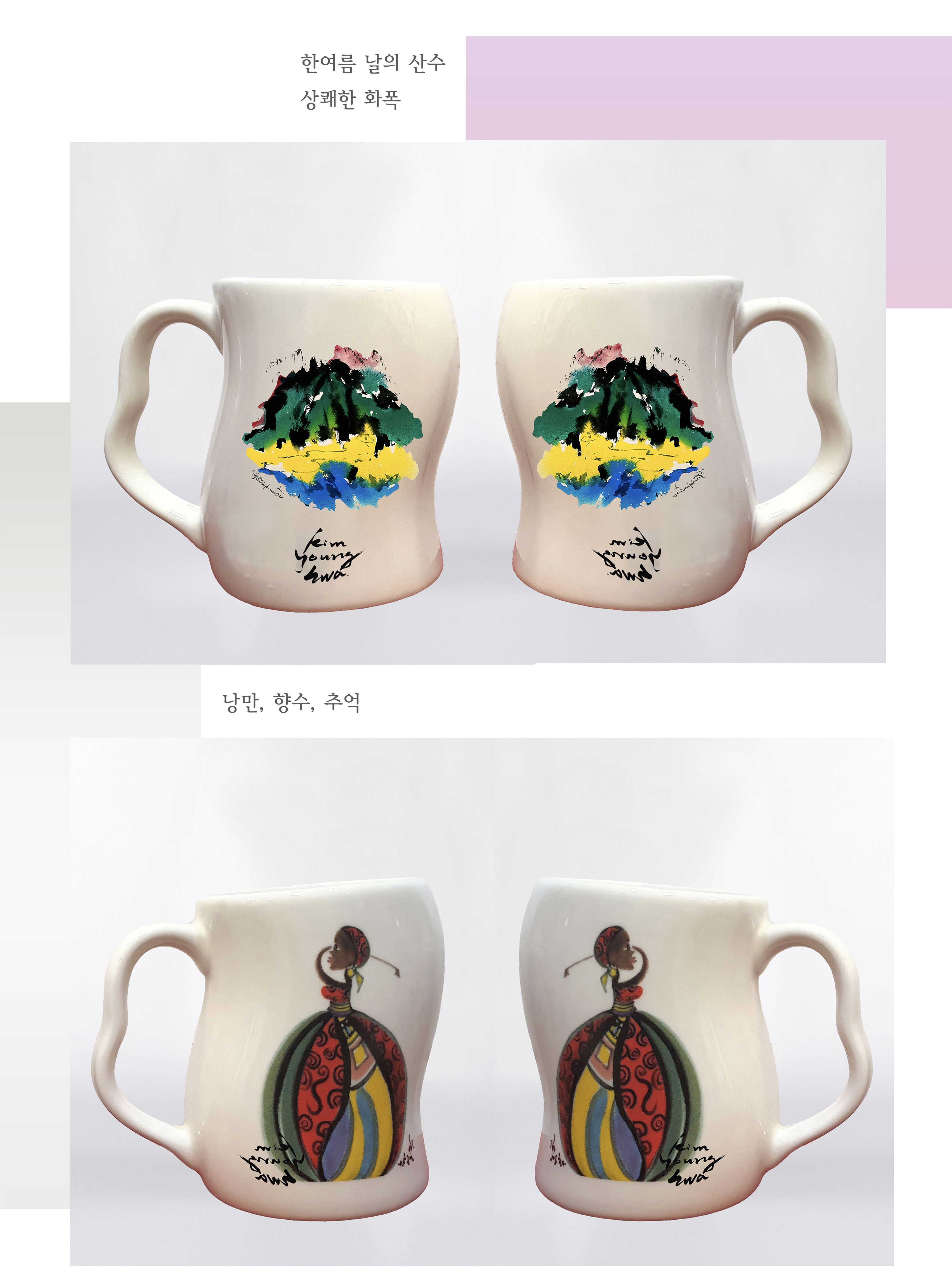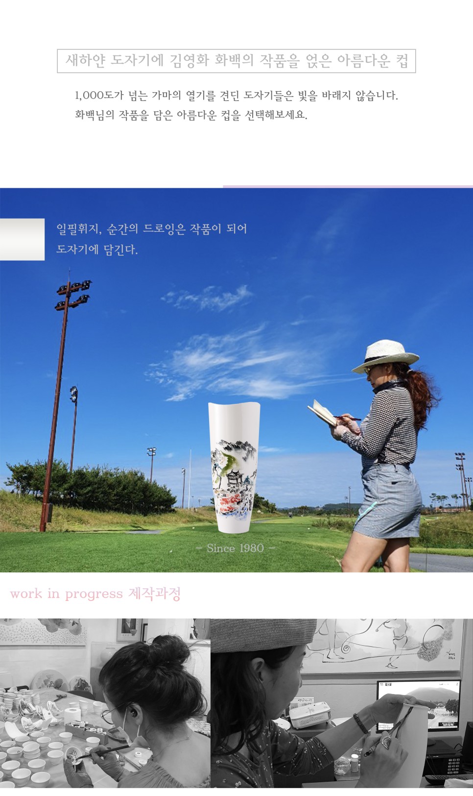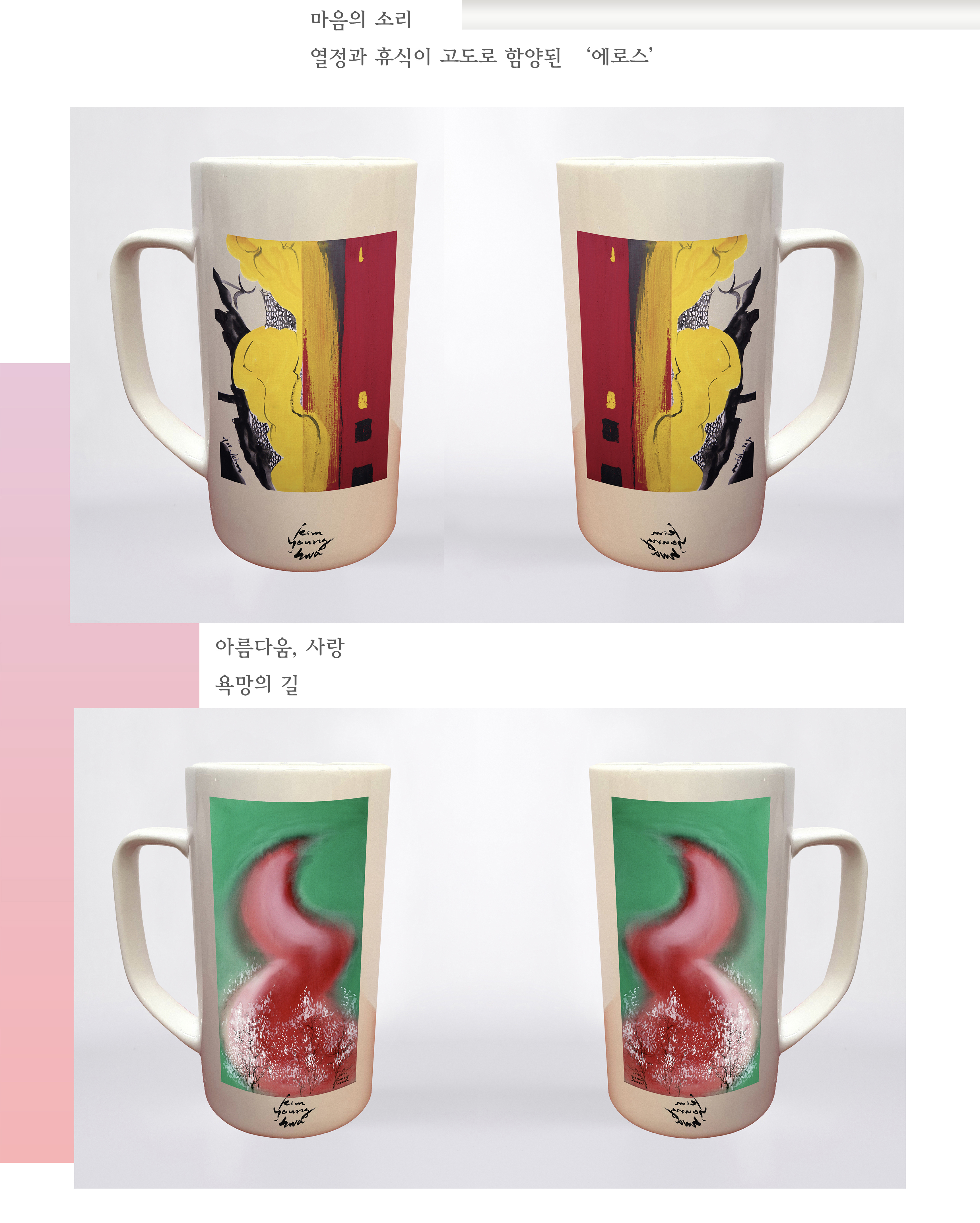 동양화와 골프라는 소재로 '사랑' ,'열정', ‘행복’, ‘에로스,’ ,'우주와의 완벽한 소통 또는 교감', ‘에너지원’ 등의 열망의 융합작품을 담아내는 김영화 화백님은 도자기 작품에도 염원이 담긴 궁극의 ‘무한無限 에너지’를 담아낸다.