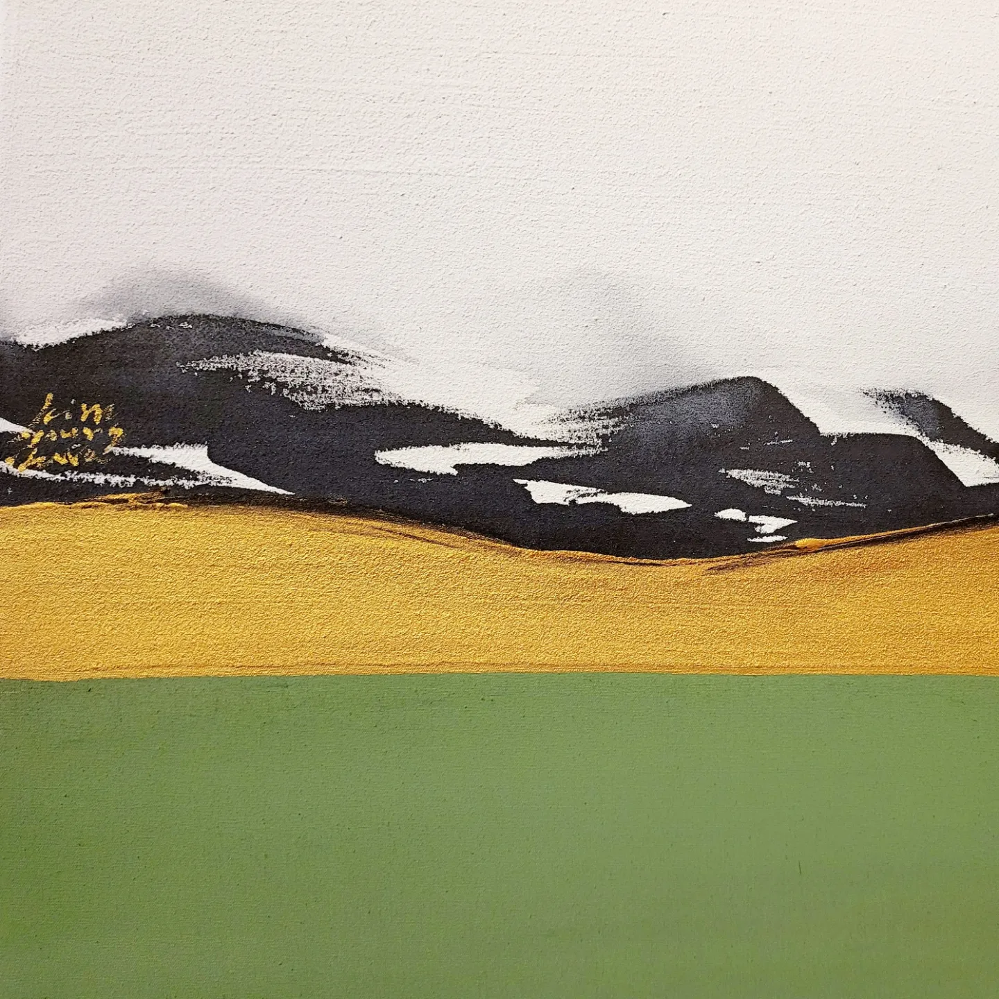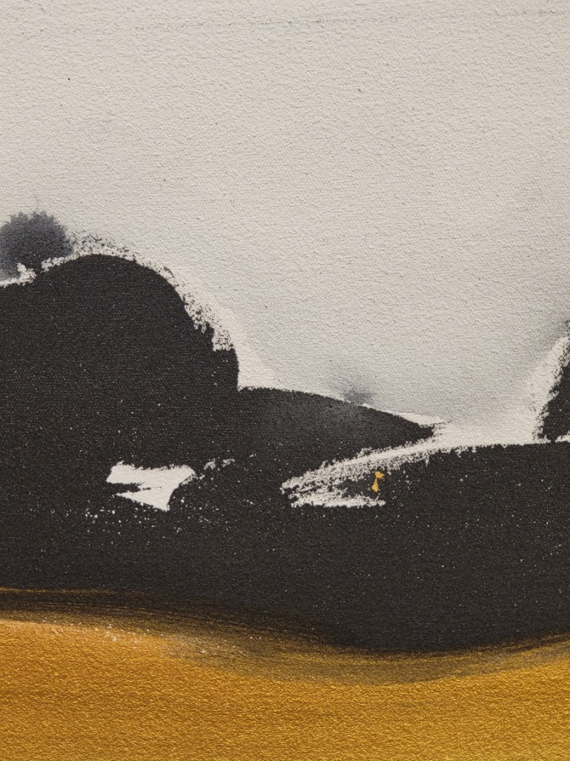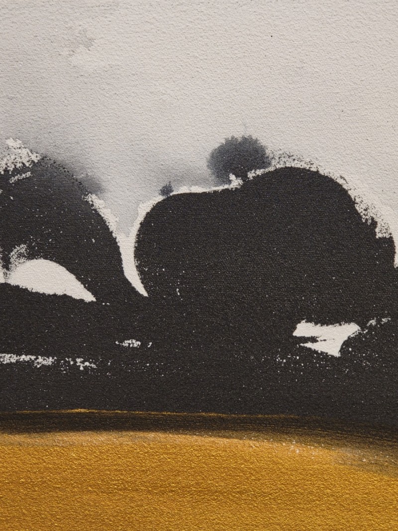 The non-figurative work of color, ink, and gold powder on the three-division plane added a sense of stability to her paintings. The number 3 means perfection. It reduces the stress of choice, creates balance and creates a sense of rhythm.