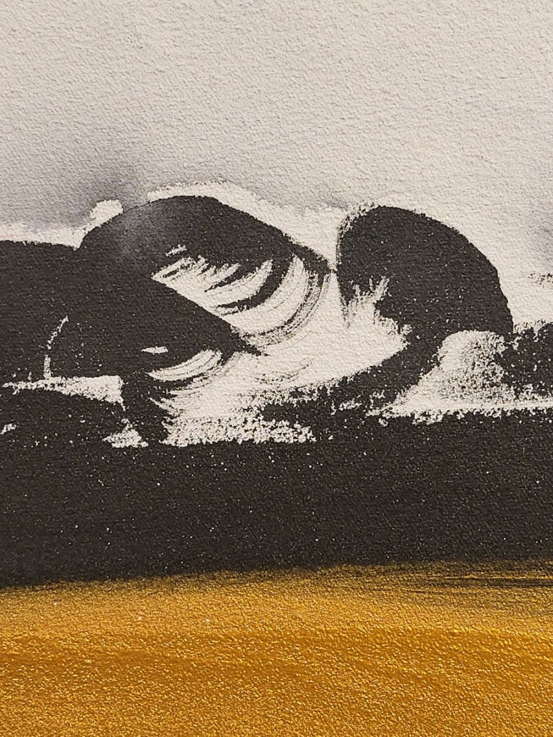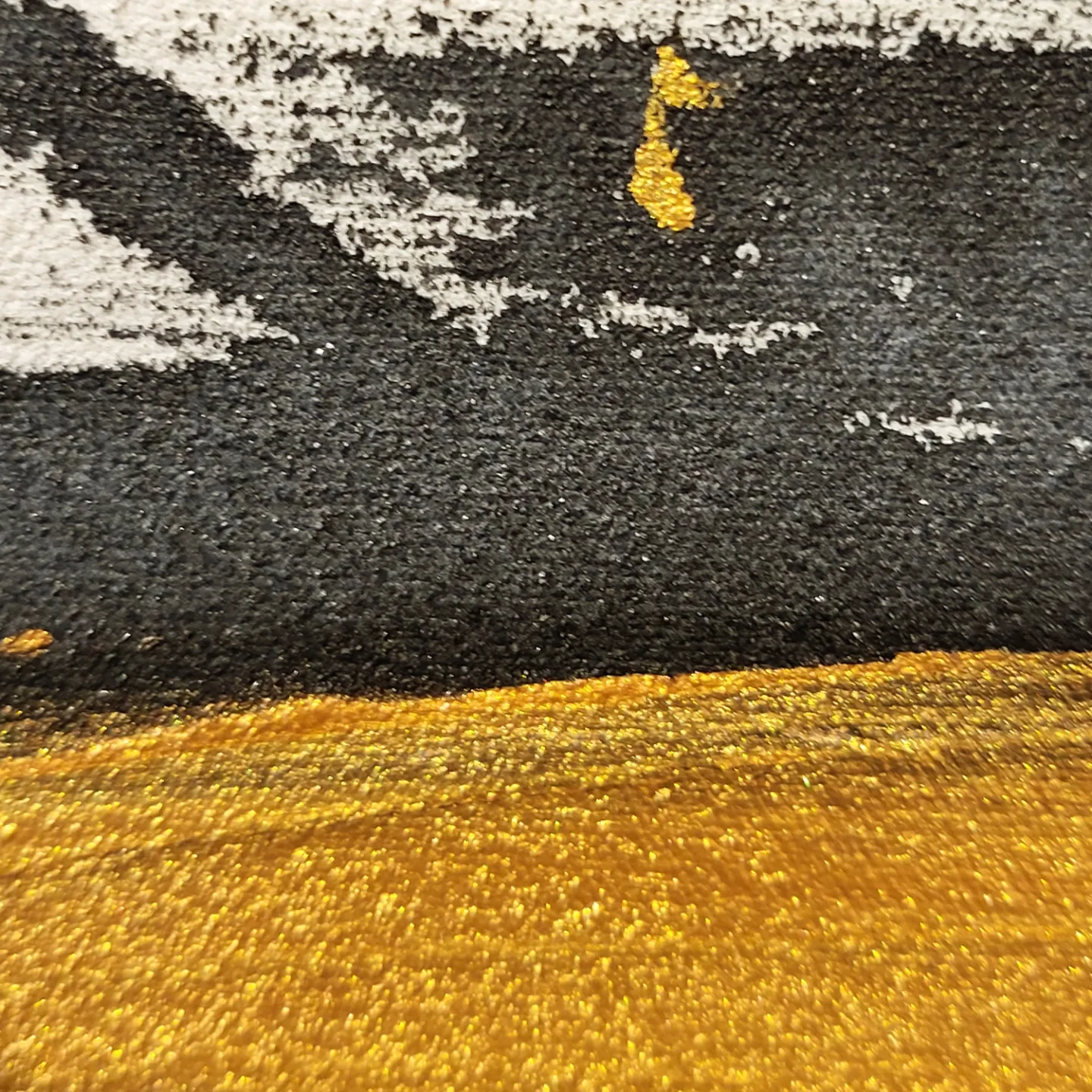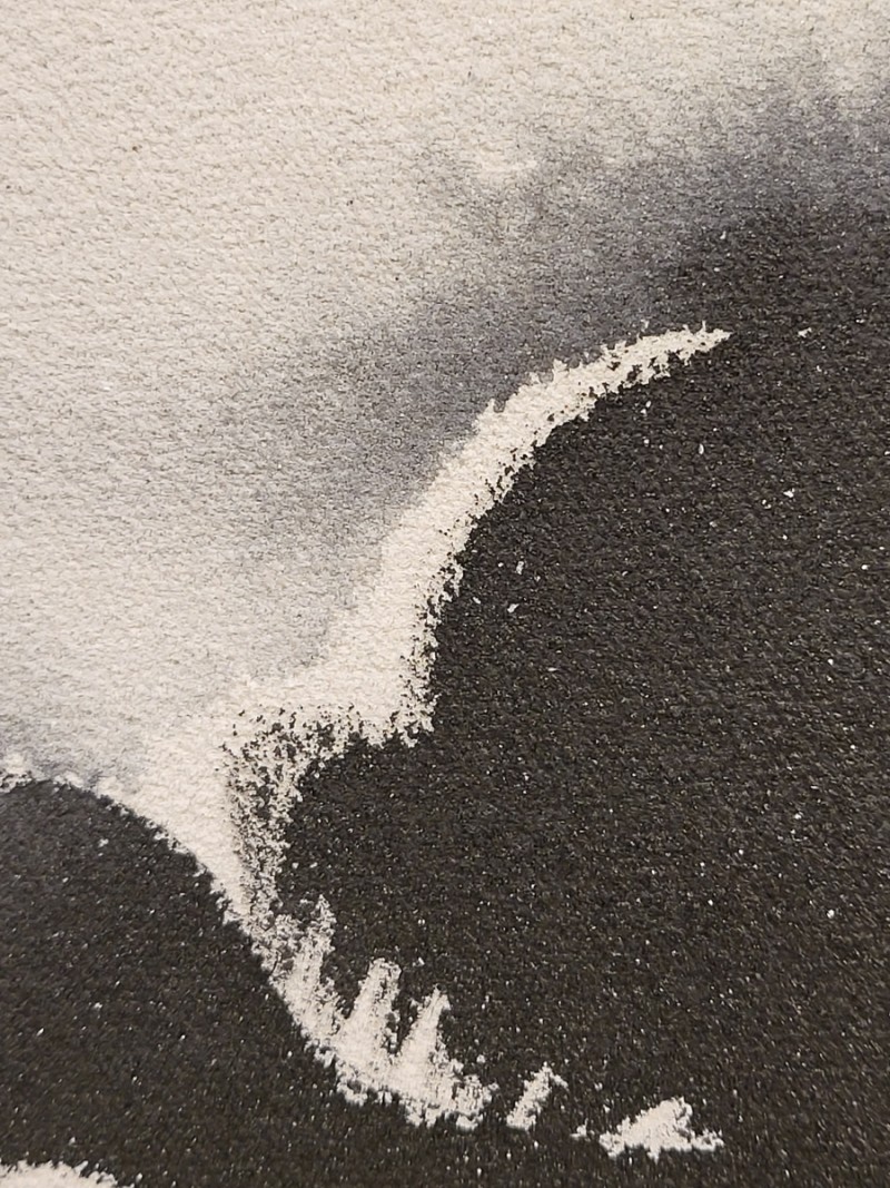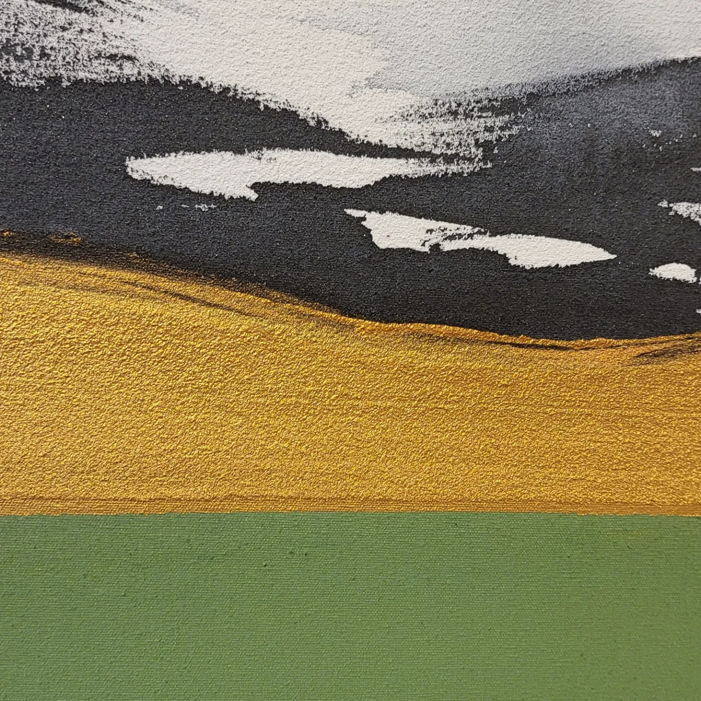 The non-figurative work of color, ink, and gold powder on the three-division plane added a sense of stability to her paintings. The number 3 means perfection. It reduces the stress of choice, creates balance and creates a sense of rhythm.